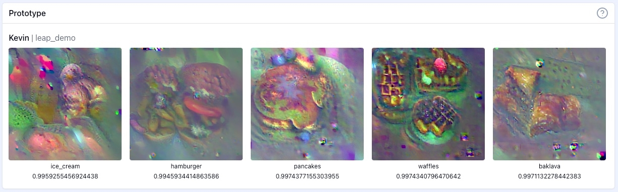 This is an example from a model trained to classify food. We generated prototypes of the classes ice cream, hamburger, pancakes, waffles, and baklava: